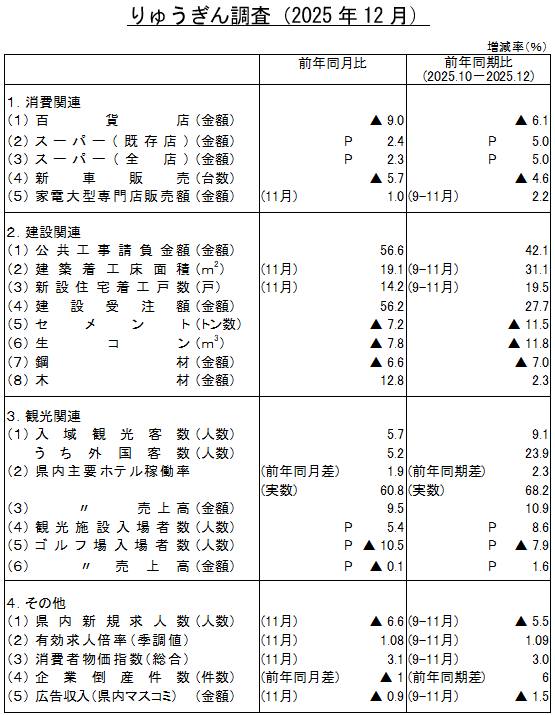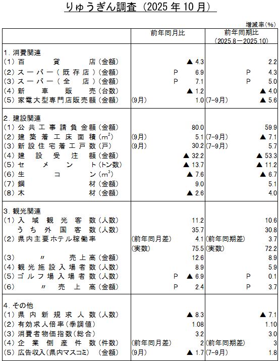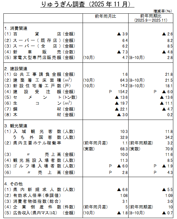 (注1)公共工事請負金額は西日本建設業保証株式会社沖縄支店調べ。建築着工床面積、新設住宅着工戸数は国土交通省調べ。県内新規求人数、有効求人倍率は沖縄労働局調べ。入域観光客数、消費者物価指数は沖縄県調べ。 企業倒産件数は東京商工リサーチ沖縄支店調べ。Pは速報値。(注2)有効求人倍率(季調値)と県内新規求人数(人数)は、就業地ベース。